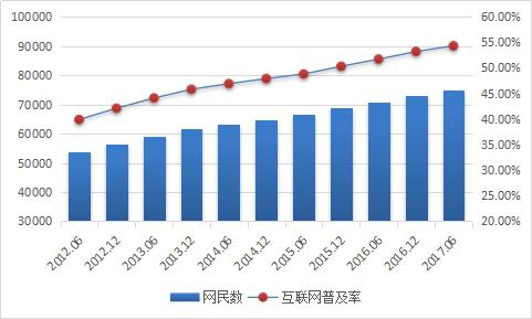 根據(jù)CNNIC最新數(shù)據(jù)顯示,截止2017年6月,我國(guó)網(wǎng)民規(guī)模達(dá)到7.51億,半年共計(jì)新增網(wǎng)民1992萬(wàn)人。互聯(lián)網(wǎng)普及率為54.3%,較2016年底提升1.1個(gè)百分點(diǎn)。我國(guó)網(wǎng)民規(guī)模增長(zhǎng)趨于穩(wěn)定,互聯(lián)網(wǎng)行業(yè)持續(xù)穩(wěn)健發(fā)展,以互聯(lián)網(wǎng)為代表的數(shù)字技術(shù)正在加速與經(jīng)濟(jì)社會(huì)各領(lǐng)域深度融合,成為促進(jìn)我國(guó)消費(fèi)升級(jí)、經(jīng)濟(jì)社會(huì)轉(zhuǎn)型、構(gòu)建國(guó)家競(jìng)爭(zhēng)新優(yōu)勢(shì)的重要推動(dòng)力。