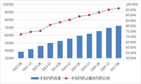 截至2017年6月,我國(guó)手機(jī)網(wǎng)民規(guī)模達(dá)7.24億,較2016年底增加2830萬(wàn)人。網(wǎng)民使用手機(jī)上網(wǎng)的比例由2016年底的95.1%提升至96.3%。,移動(dòng)互聯(lián)網(wǎng)經(jīng)過(guò)多年發(fā)展已經(jīng)進(jìn)入相對(duì)成熟階段。過(guò)去幾年來(lái),移動(dòng)網(wǎng)民增速遠(yuǎn)超過(guò)整體網(wǎng)民增速,中國(guó)整體網(wǎng)民的增長(zhǎng)已經(jīng)由PC網(wǎng)民增長(zhǎng)轉(zhuǎn)移到移動(dòng)網(wǎng)民的增長(zhǎng)。移動(dòng)端網(wǎng)民數(shù)的快速增長(zhǎng),直接推動(dòng)短視頻行業(yè)發(fā)展。