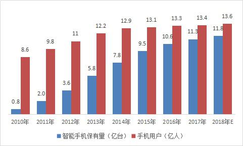 2010-2018年中國(guó)智能手機(jī)保有量