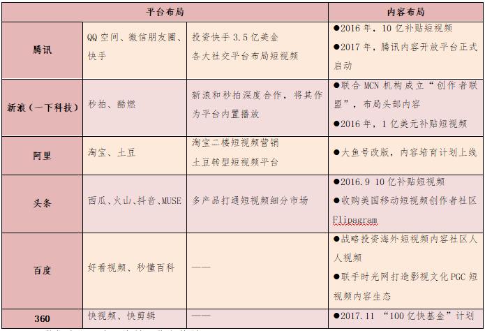 以BAT為首的機(jī)構(gòu)重金加速布局短視頻平臺(tái)。今日頭條、騰訊、秒拍等均投入10億元扶持短視頻內(nèi)容創(chuàng)業(yè)者。阿里投入20億元進(jìn)軍短視頻領(lǐng)域,將土豆網(wǎng)打造為專門的短視頻平臺(tái)。騰訊專門成立短視頻中心,負(fù)責(zé)短視頻平臺(tái)運(yùn)行;愛(ài)奇藝短視頻平臺(tái)的愛(ài)奇藝頭條正在內(nèi)測(cè);秒拍成為新浪微博獨(dú)家短視頻應(yīng)用,從工具型短視頻機(jī)構(gòu)轉(zhuǎn)型為社交分享類短視頻平臺(tái);華人文化基金領(lǐng)投的資訊類短視頻平臺(tái)梨視頻也已形成業(yè)內(nèi)影響力;咪咕視訊作為中國(guó)移動(dòng)在視頻領(lǐng)域的唯一版權(quán)運(yùn)營(yíng)實(shí)體,也布局短視頻,與中央電視臺(tái)共建業(yè)內(nèi)領(lǐng)先的短視頻創(chuàng)作者聚集平臺(tái),打造頭部賬號(hào)體系,孵化自有明星短視頻賬號(hào),引入知名工作室直接簽約,盤整已有的強(qiáng)IP資源賬號(hào)化運(yùn)作。