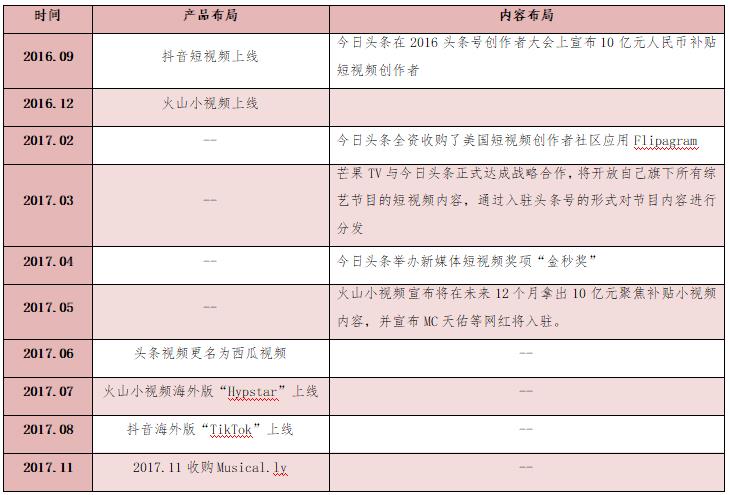 2016年9月20日,今日頭條正式宣布入局短視頻,創(chuàng)始人張一鳴也公開(kāi)表示短視頻將是內(nèi)容創(chuàng)業(yè)的下一個(gè)風(fēng)口,隨后今日頭條開(kāi)始全面布局短視頻。