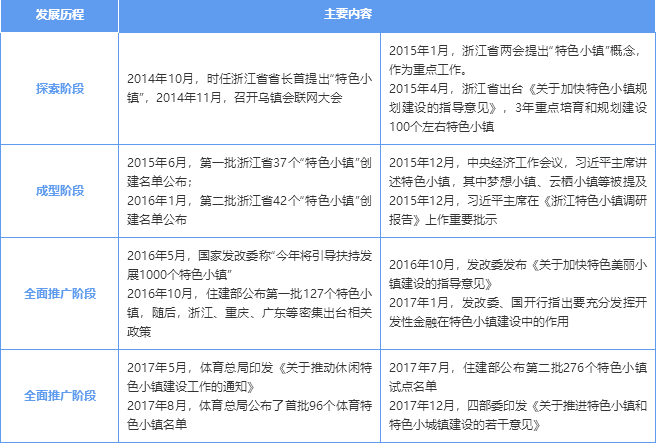 改革開放以來,我國特色小鎮(zhèn)經(jīng)歷了三個發(fā)展階段:第一階段即探索階段,2014年浙江省省長李強首提“特色小鎮(zhèn)”;第二階段為成型階段,習近平在《浙江特色小鎮(zhèn)調(diào)研報告》上做了重要批示;第三階段為全面推廣階段,這個階段特點為國家發(fā)布引導政策,隨后地方政策密集出臺,全國各地特色小鎮(zhèn)建設(shè)如火如荼。