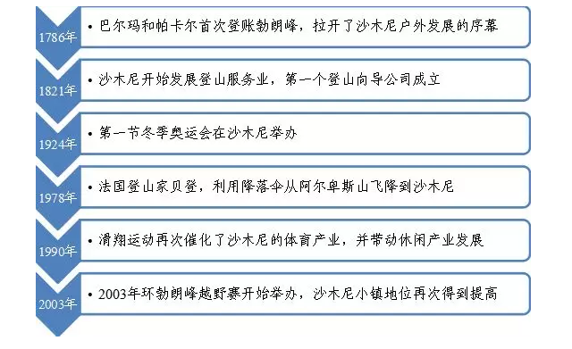 沙木尼的作為特色小鎮(zhèn)的最初起源,來自1786年8月當?shù)孬C人巴爾瑪和醫(yī)生帕卡爾兩人首次登上勃朗峰;1821年開始,沙木尼開始發(fā)展登山服務(wù)業(yè),小鎮(zhèn)內(nèi)34名的本地向?qū)ЫM成了一個向?qū)Ч荆?924年第一屆冬季奧運會在沙木尼舉辦,世界性的滑雪教練訓練中心也在這里落戶。至此,沙木尼的特色小鎮(zhèn)地位已經(jīng)基本