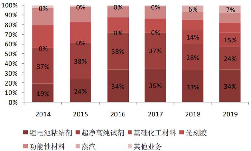 2018年,公司實(shí)現(xiàn)營(yíng)業(yè)收入14.46億元,同比增長(zhǎng)76.23%,實(shí)現(xiàn)歸母凈利潤(rùn)2.84億元,同比增長(zhǎng)239.37%。其中電子化學(xué)品占公司總營(yíng)收的64.9%,是公司最主要的收入來(lái)源。