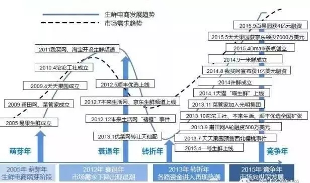 2005年,易果網(wǎng)成立,2008年,出現(xiàn)了專注做有機(jī)食品的和樂康及沱沱工社,這幾個(gè)企業(yè)都專注于小眾市場。在此期間,國內(nèi)頻發(fā)食品安全事件,導(dǎo)致很多消費(fèi)者產(chǎn)生了對高品質(zhì)、高安全性食材的需求,這使得很多企業(yè)看到了生鮮這個(gè)巨大市場,在2009年-2012年之間,涌現(xiàn)了一大批生鮮電商。過多的商家進(jìn)入這個(gè)行業(yè),也導(dǎo)致了行業(yè)泡沫的產(chǎn)生,當(dāng)時(shí)的市場需求并沒有那么大,加上冷鏈物流及信息技術(shù)水平不配套,而生鮮電商的模式也是原封不動(dòng)的COPY了普通電商的模式,最終導(dǎo)致了很多企業(yè)倒閉。