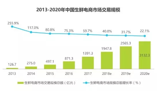 2017年中國生鮮電商市場交易規(guī)模約為1391.3億元,同比增長59.7%,預(yù)計(jì)2020年,生鮮電商交易規(guī)模可以達(dá)到3132億元。一方面基于消 費(fèi)者消費(fèi)習(xí)慣養(yǎng)成,另一方面基于冷鏈和倉儲系統(tǒng)迅速完善。