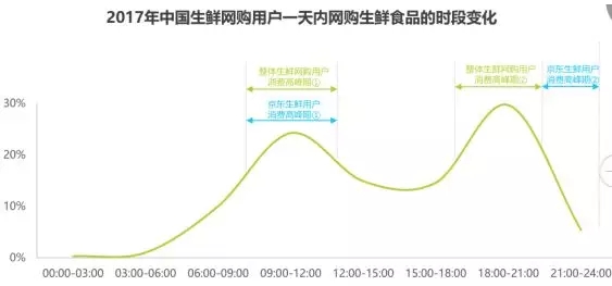 18:00-21:00是生鮮食品的消費(fèi)集中段,用戶根據(jù)需求的即時(shí)性選擇不同的平臺購買生鮮食品。