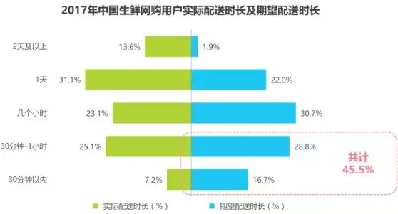 用戶期待更快速的配送體驗(yàn),45.5%的用戶希望配送時(shí)長在1小時(shí)內(nèi)。