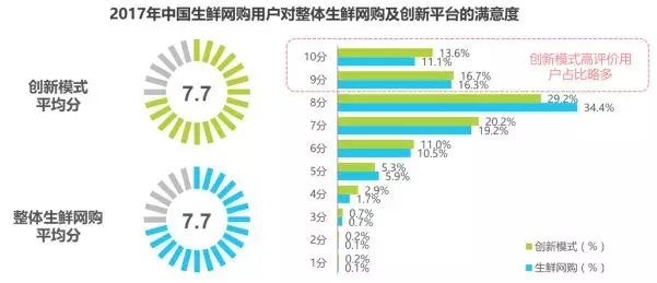用戶對創(chuàng)新模式整體較為滿意,滿意度與整體生鮮網(wǎng)購基本持平,高評價(jià)用戶占比略多。