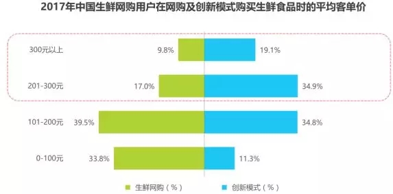 從消費(fèi)金額來看,用戶在創(chuàng)新模式消費(fèi)的單均價(jià)明顯高于生鮮網(wǎng)購整體,超過50%的用戶在創(chuàng)新模式消費(fèi)的單均價(jià)超過200元。其中,19.1%的用戶在創(chuàng)新模式消費(fèi)單均價(jià)超300元,而這一比例在整體生鮮網(wǎng)購平臺僅9.8%。34.9%的用戶在創(chuàng)新模式的客單價(jià)在201-300元之間,僅有17.0%的整體生鮮網(wǎng)購用戶客單價(jià)在這一區(qū)間。