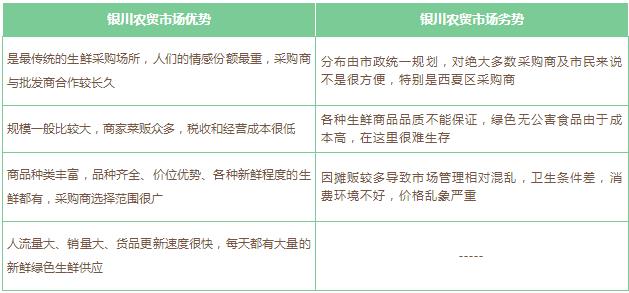 在銀川本地,主城范圍內(nèi)除最早建立的北環(huán)批發(fā)市場外,再?zèng)]有專業(yè)的大型生鮮批發(fā)市場,近幾年發(fā)展起來的有:四季鮮果蔬批發(fā)市場、21世紀(jì)冷鏈批發(fā)市場、海吉星農(nóng)副產(chǎn)品物流園、潤恒農(nóng)產(chǎn)品市場等都在郊區(qū)。大型農(nóng)產(chǎn)品交易市場是傳統(tǒng)生鮮流通中不可缺少的一環(huán),是各社區(qū)農(nóng)貿(mào)市場及超市生鮮尤其是蔬菜水果的主要來源,具有成交量大、知名度高、社會影響大、流通體系健全、配套完整等優(yōu)勢,但也存在傳統(tǒng)生鮮流通方式的不足。