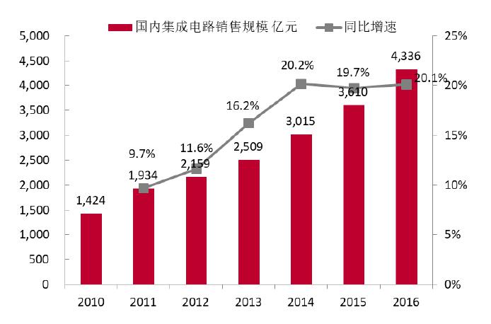 2016年中國集成電路產(chǎn)業(yè)繼續(xù)高速增長的勢頭,從半導(dǎo)體行業(yè)協(xié)會的2017年最新統(tǒng)計,2016年中國集成電路產(chǎn)業(yè)銷售額高達(dá)4335.5億元,比2015年增長20.1%。